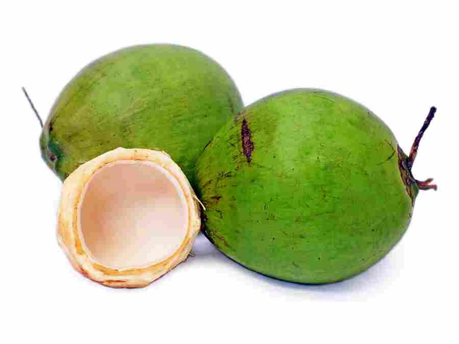 A young coconut, still encased in its green husk. It's prized for its refreshing, clear water and soft, jelly-like flesh. The water is a natural source of electrolytes, while the flesh is a good source of fiber and healthy fats.